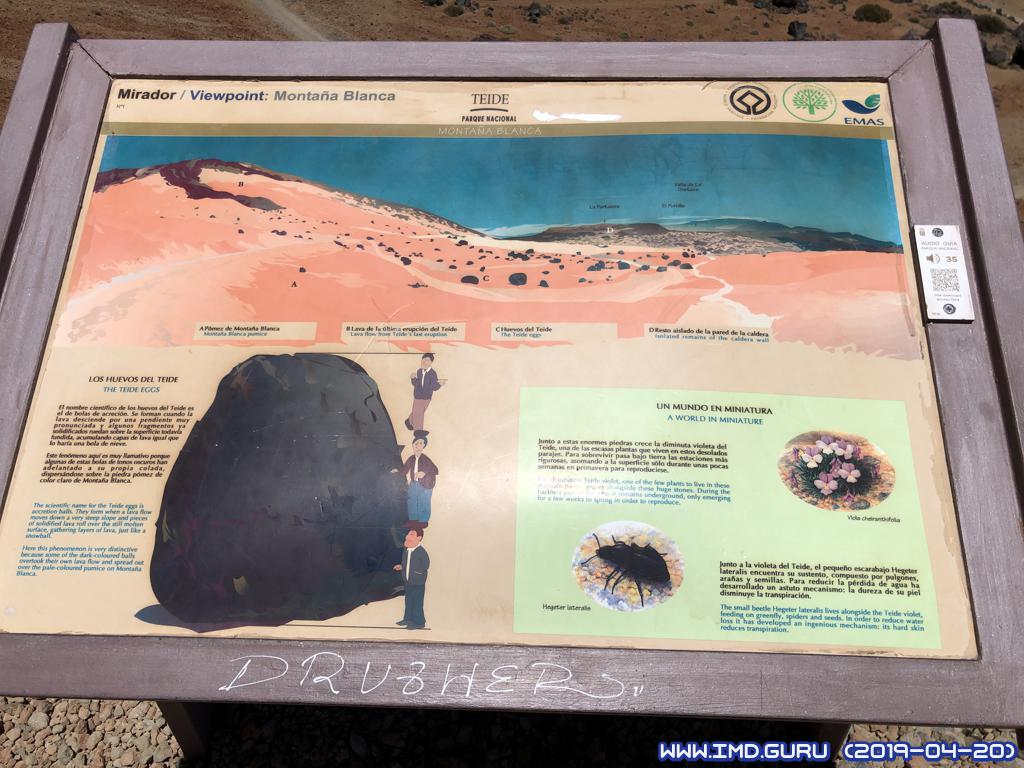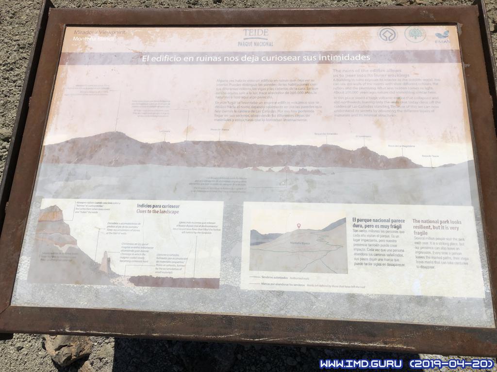 Seguimos el sendero siempre haia Montaña Blanca sin perdida hasta que lleguemos a un panel sobre el parque nacional para segui hasta el mirador de Montaña Blanca y los huevos del Teide, que son piedras redondas.