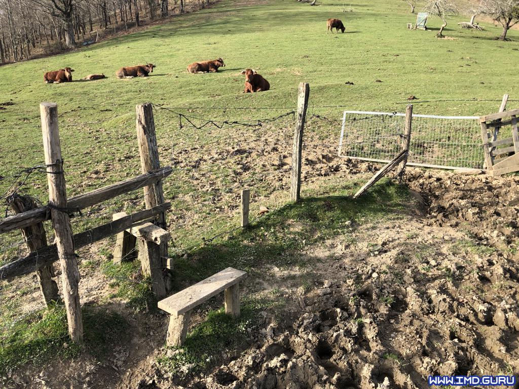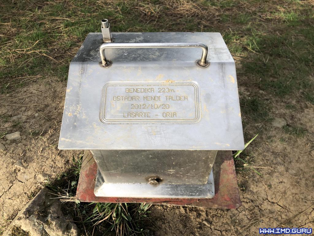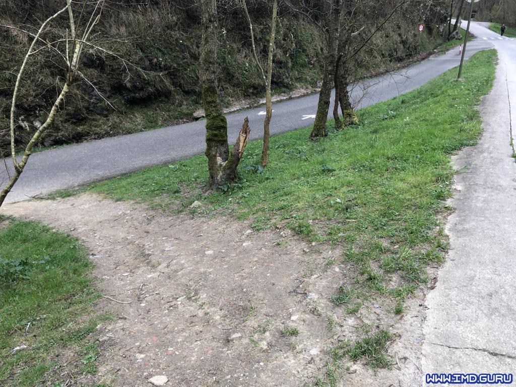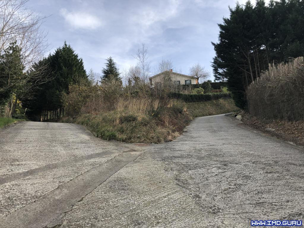 Seguimos por la acera y luego carretera entre caseríos con varios sube u baja y cierta pendiente hasta que damos a una pista la cual termina en un camino de tierra donde giramos a la izquierda cruzando dos pasos para subir al Benedika.